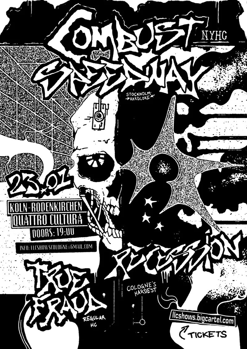New year, new LLC extravaganza with COMBUST (YOU KNOW IT’S NYHC), SPEEDWAY (Hardest working band in Europe right now?), TRUE FRAUD (The band with the anti corporate HC anthem), and RECESSION (Music crafted in the tower blocks of Zollstock).
